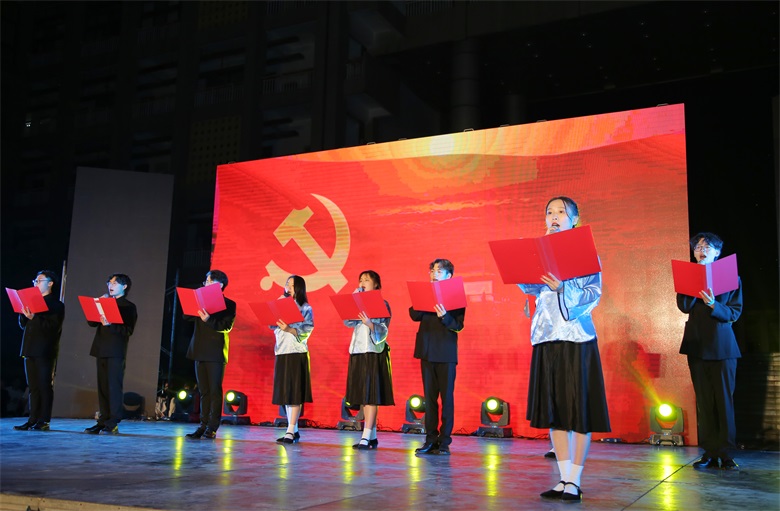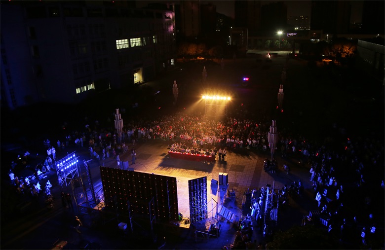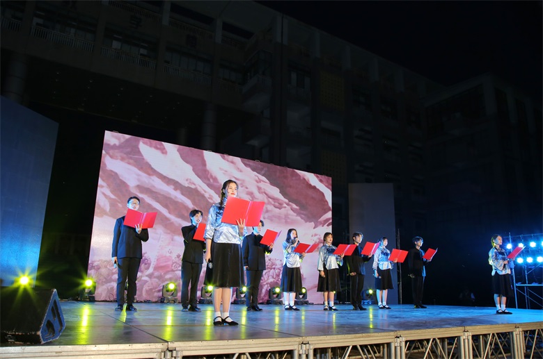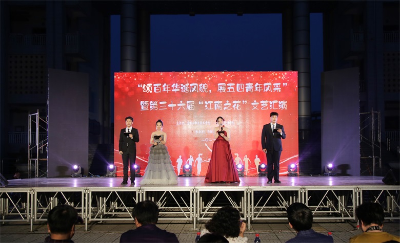为献礼中国共产党成立100周年华诞,庆祝中国共产主义青年团成立99周年,纪念五四运动102周年,5月7日晚,以“颂百年华诞风貌,展五四青年风采”为主题的五四文艺汇演在北区教学楼前广场举行。副院长甄炯、吴彩林、杨辉亚,以及学生处、团委、各系700余名师生共同观看演出。